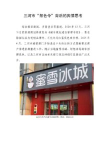 综合极目新闻、齐鲁壹点等报道,2024 年 12 月,三河市自然资源规划局曾发布《城市规划建设管理导则》,要求除国际国内连锁品牌外,不允许用红蓝底色或字样。2025 年4 月,三河市城管部门开始通过口头传达的方式强制要求商户推进招牌整改工作,随后当地蜜雪冰城、好想来等商家招牌改色,以及三河市当地有关部门回应持续引发舆论广泛关注。