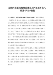 4.无处不在:计算+网络+智能无处不在的计算。现代信息科技,一切源于计算。进入 20 世纪以来,人类计算能力显著增强,经历了从晶体管到电子管再到集成电路,从房间体积到桌面体积再到口袋体积的变迁。1946 年,计算机始祖 ENIAC(埃尼阿克)装配 18000个真空管,重达 30 吨,占地 170 平方米;2014 年的英特尔酷睿 7,尺寸为 177 平方毫米,包含 14 亿个晶体管。现在,能唱“祝你生日快乐”的电子贺卡的芯片能力超过二战时期所有盟军计算能力的总合;一部苹果手机的计算能力就足以完成阿波罗计划(1969 年)所需要的计算工作。20 世纪 60 年代,由于分时技术出现,大型计算机设备的计算处理能力开始能够分配给远程用户,小型计算机和个人电脑也都开始互相连接成网。