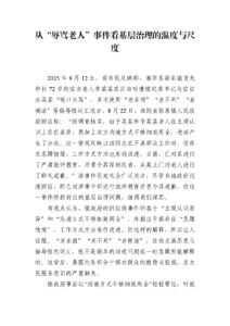 2025 年 8 月 12 日,有市民反映称,湘阴县新泉镇青龙 桥村 72 岁的信访老人李某某在回访时遭镇纪委书记与信访 办吴某“破口大骂”。多次使用“老东西”“老不死”“老 糊涂”等侮辱性词汇攻击。8 月 22 日,湘阴县新泉镇人民政 府回应称:“经调查核实,由于吴某和李某某老人在主观认 识上存在差异,再加上双方沟通方式不够细致周全,进而产 生了分歧。这一情况反映出该同志在开展群众工作时,还存 在急躁情绪,工作方式方法也有待改进。目前,已对其进行 了严肃批评教育,并责令其深刻反省,吴某上门对老人进行 了赔礼道歉。”该事件引发社会广泛关注,尽管当地政府迅 速回应,称已对涉事干部进行批评教育并责令其道歉,但这 一事件所折射出的基层治理问题,值得我们深思。