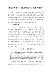 近期,广西平乐县、山西五台县接连曝出的政府公文抄 袭事件,其中,平乐县森林防火规划照搬湖南安化水文数据, 连外地乡镇名都未改;五台县县长调研稿与他人作品高度雷 同,超 320 字重复。两地官方虽快速回应,但甩锅倾向严重, 舆情应对回应内容模糊、未提及后续整改措施。