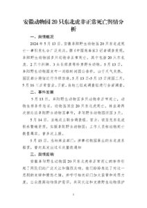 2024年5月13日,安徽阜阳野生动物园20只东北虎死亡一事引发社会广泛关注。据《中国慈善家》记者调查发现,阜阳野生动物园多只动物非正常死亡,其中包括20只东北虎、2只非洲狮、3头长颈鹿等珍贵野生动物。5月13日,阜阳野生动物园发布一则临时闭园公告称,由于天气炎热,园区部分场馆进行升级改造,5月13日-5月15日闭园三天,5月16日正常营业。目前,当地已组成调查组进行全面调查。