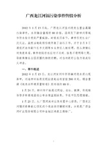 2012 年 1 月 15 日起,广西龙江河宜州段发生重金属镉污染事件,水质镉含量超标 80 余倍,沿岸及下游柳州等城市饮水安全受到严重威胁。时值农历春节,事件引发社会广泛关注。虽然当地政府后续开展了治污工作,并于 2 月 3 日通报河池市副市长李文纲等 9 名责任人被处理。但从舆情应对角度来看,事件初期存在应对不及时、信息不透明等问题,导致舆情在全国范围内持续发酵,对当地政府公信力造成较大冲击。