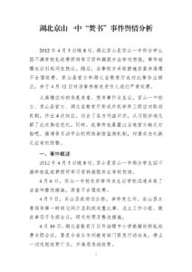 2012年4月5日晚8时,湖北京山县京山一中部分学生因不满学校乱收费而将学习资料撕毁并在学校焚烧,事件被曝光后引起网友热议。随后,当事校方采取措施自查并清理不合理收费,京山县官方和湖北省教育厅也对此事作出回应,并于4月12日对该事件相关责任人进行严肃处理。从舆情应对的角度来看,焚书事件发生后,京山一中校方、京山县官方、湖北省教育厅形成危机事件三级应对联动机制,作出4次回应,迎合了各方利益诉求,从而较好地化解了此次舆论危机。同时,此事件也暴露出当地官方缺乏对贴吧、微博等互动平台的网络舆情监测机制,对潜在危机缺乏应有的预警。