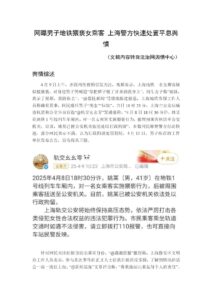 4 月 9 日上午,多段网传视频引发关注,视频显示,上海地铁一名女乘客疑 似被猥亵,对身边男子哭喊道“你把裤子脱了并弄到我身上”,同车女子称“姐妹, 我录了视频,我陪你去”。“@荔枝新闻”等媒体跟进报道,上海地铁客服工作人 员称确有其事,网民痛斥男子“变态”“垃圾”。当日 10 时 23 分,上海市公安局城 市轨道和公交分局官微“@轨交幺幺零”发通报称,“4 月 8 日 18 时 30 分许,姚某 在地铁 1 号线列车车厢内,对一名女乘客实施猥亵行为,被周围乘客扭送至公安 机关。目前,姚某已被公安机关依法处以行政拘留”。多数网民称赞警方行动快 速;部分网民表示不满,认为行政拘留处罚较轻。4 月 10 日,男子所在的工作 单位发布公告,宣布将其开除。