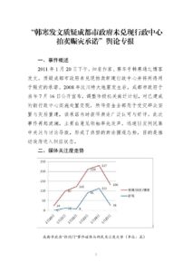 2011 年 1 月 20 日下午,知名作家、赛车手韩寒通过博客发文,质疑成都市政府未兑现拍卖新建行政中心并将所得用于赈灾的承诺。2008 年汶川特大地震发生后,成都市政府于当年 7 月 16 日公开宣布,调整市级机关南迁计划,对已建成的新行政中心实施处置变现,所得资金全部用于受灾群众安置与灾后重建,该承诺当时获得舆论广泛认可与好评。此次事件再起波澜,主要由意见领袖率先发声,迅速引发网民集中关注与讨论导致,形成了典型的舆论围观态势,目的是推动政府进入回应状态。