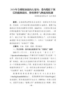 全球能源治理体系正在经历一场深刻的范式转 移。传统的、以市场供需为基础的国际石油秩序,遭遇了地 缘政治力量的直接解构与重塑。2026年初,以美国对委内瑞 拉国家能源资产的全面行政与军事接管为标志性事件,一种 新型的“监管性霸权”模式已然浮现。这一模式的核心特征 在于:通过主权干预,将关键战略资源的生产、定价与物流 通道置于单边行政权力的管辖之下,从而以“行政配给”逻 辑系统性取代“市场调节”逻辑。